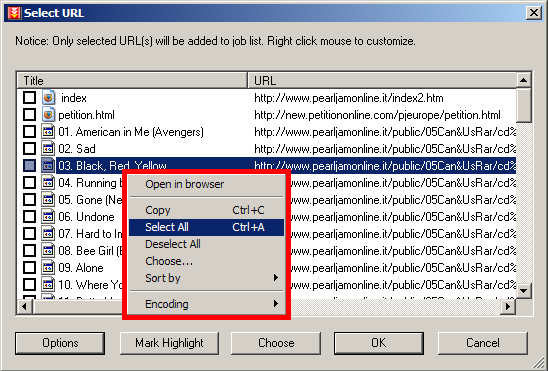 Tambien podemos utilizar el botón derecho del ratón para seleccionar todos o ninguno de los enlaces presentes: