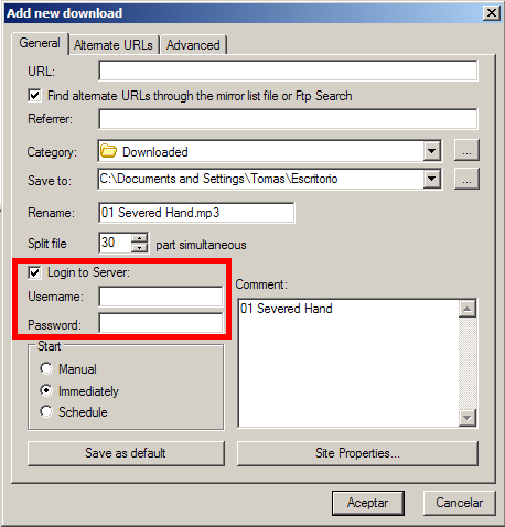 Ahora un pequeño gran detalle. Si queremos descargar algo de un sitio que requiera un nombre de usuario y contraseña (servidor privado), tenemos que agregar ambos datos en el programa, a la hora de seleccionar el directorio donde queremos que se descarguen: