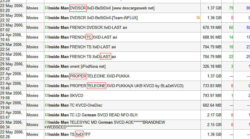 Los nombres y etiquetas que describiremos a continuación son puestos por los grupos, lo que no quita que haya malhechores que las distribuyen con nombres falsos (ofreciendo una cosa que en realidad es otra), cosa que, por cierto, suele suceder infinitas veces más en programas como el eMuLe y KaZaA que en nuestro querido bittorrent.