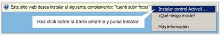 Hola,a mi me salió todo eso de las pantallas e instalar el activeX pero cuando el día ala otra opción de utilizar el método antiguo,me salió la barra esa de la que habla todo el mundo en mitad de la pantalla y no puedo subir fotos.Si alguien sabe donde puede volver a salir esa pantalla del activeX o donde bajarlo e instalarlo por favor que avisen,porque lo he probado todo.