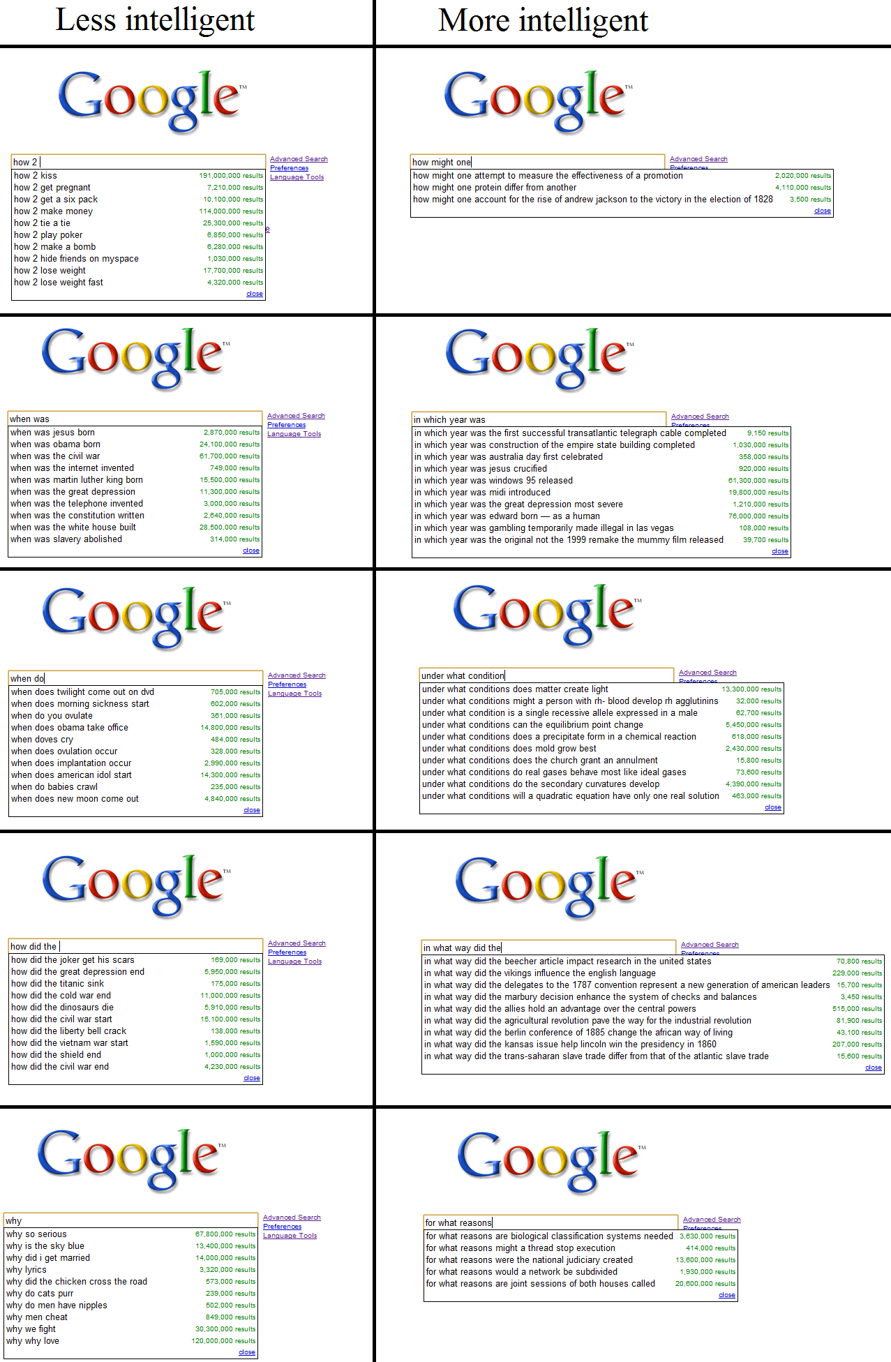 Me acabo de encontrar en los compartidos del Google Reader de Alexliam una imagen con mucha miga que juega con las sugerencias de búsquedas en Google. No os digo más. Refrescad vuestro inglés y a ver si encontráis las diferencias ;-)