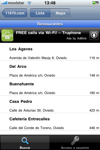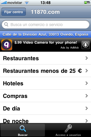 El precio de esta aplicación es de 0€ con publicidad (poco agresiva como veréis en las capturas) y de 1,59 la versión PRO sin publicidad, que en el futuro tendrá funcionalidades exclusivas. Lógicamente hay muchas aplicaciones parecidas pero lo bueno de 11870 es que como es producto nacional, tiene muy buena información de locales españoles.