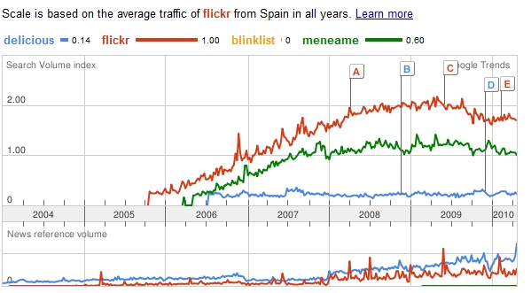 ¡Y la idea era buenísima! De hecho nosotros tenemos cuenta en Delicious y muchísima gente que conozco también pero es que es la misma gente que la tenía cuando salió. La capacidad de Delicious para captar nuevos seguidores es lamentable. Aquí un grafiquito de Google Trends que ya sabéis que me gusta mucho: