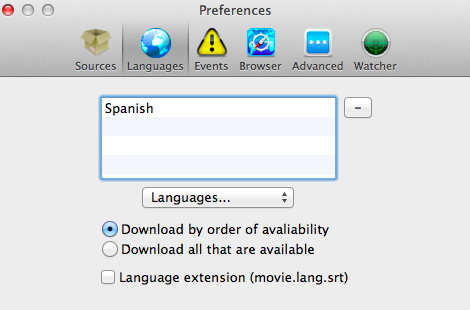 Aquí podrás elegir el idioma de descarga, si quieres confirmar la descarga o que elija por tí o que te abra el navegador si no encuentra el subtítulo que deseas. Os recomiendo echarle un ojo.